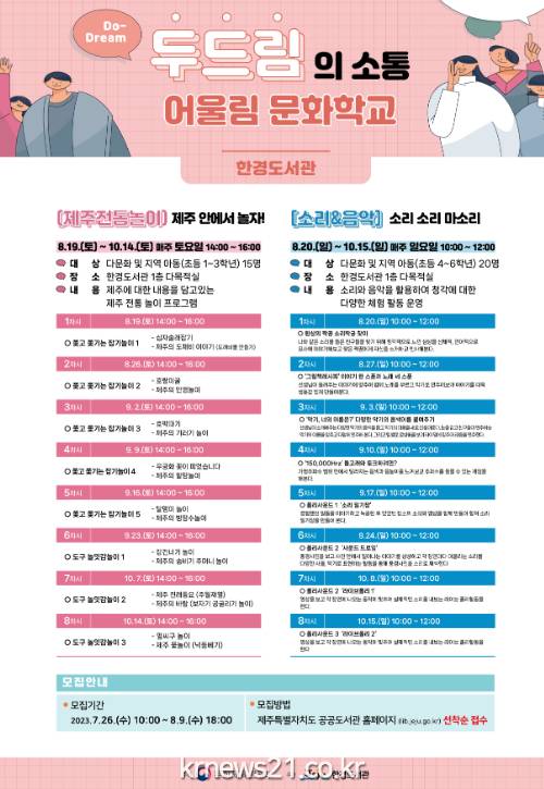 한편 한경도서관은 문화체육관광부에서 지원하는「2023년 전국 도서관 다문화 서비스 지원사업」에 2022년에 이어 2년 연속으로 선정되어 「두드림(Do-Dream)의 소통 어울림 문화학교」를 운영하고 있다.