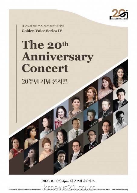 이번 ‘20주년 기념콘서트’는 대구오페라하우스의 역사와 대구 오페라의 역사를 만들어 온 스무 명의 성악가들과 함께하게 되며, 소프라노 신미경·최윤희·유소영·류진교·조영주·주선영·김정아·배혜리·김상은, 메조소프라노 김정화·김민정, 테너 김완준·손정희·최덕술·한용희·김성빈, 바리톤 이인철·김상충·방성택, 베이스 김요한 등 쟁쟁한 성악가들이 대거 참여해 그야말로 ‘별들의 잔치’가 될 예정이다.