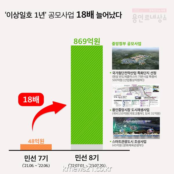 ▲ 사진=용인특례시가 민선8기 1년간 공모사업으로 869억원을 확보했다민선 8기 용인특례시의 이상일호가 항해 1년 만에 각종 공모사업에서 869억원이나 되는 예산을 따내는 기념비적인 성과를 올렸다. 시의 전략과 이 시장 특유의 추진력이 어우러져 이뤄낸 결실이라는 것이 시 관계자들의 평가다.