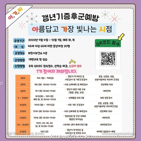 아름답고 가장 빛나는 시점 2기는 9월 운영 예정으로 이달부터 신규 접수자를 모집하고 있다. 참여를 희망하는 45세 이상 65세 미만 부천시 여성은 부천시보건소 홈페이지(pubhealth.bucheon.go.kr)를 통해 사전 접수하면 된다.