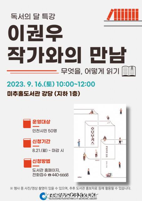 강좌는 9월 16일 오전 10시 미추홀도서관 지하 1층 강당에서 진행되며 ‘책 읽기의 달인, 호모부커스’, ‘책읽기부터 시작하는 글쓰기 수업’ 등의 저자인 이권우 작가와의 만남 형식으로 이뤄진다.