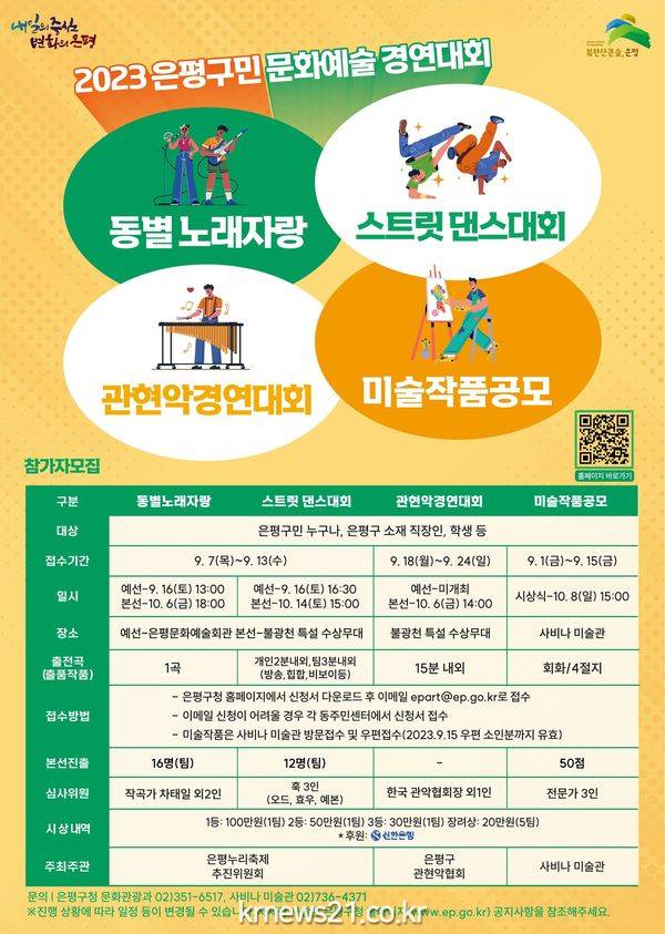 대회는 ▲동별 노래자랑 ▲스트릿 댄스 대회 ▲관현악 경연대회 ▲미술작품 공모전 등 4개 분야에서 치러진다. 불광천 특설 수상 무대에서 본선을 개최하며, 미술작품공모전은 사비나미술관에서 진행한다.