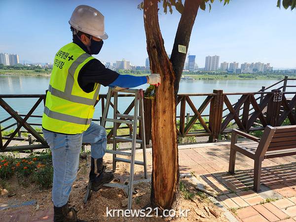 ▲ 사진=여주시여주시(시장 이충우)는 남한강이 한눈에 보이는 강변로 일원 벚나무 가로수의 부패 방지와 원활한 생육을 위해 외과수술을 시행하였다고 밝혔다.