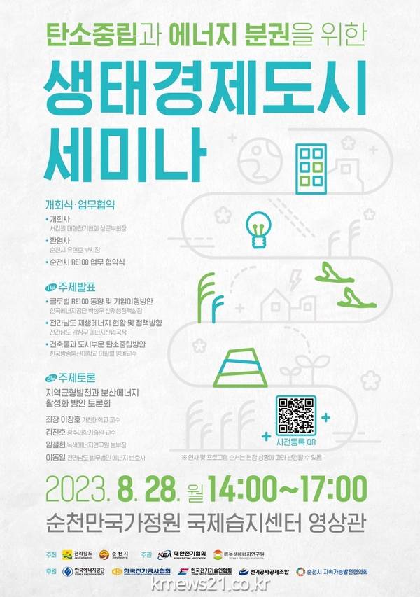 전라남도와 순천시는 오는 28일 순천만국가정원 국제습지센터 영상관에서 ‘탄소중립과 에너지 분권’을 주제로 생태경제도시 세미나를 개최한다.