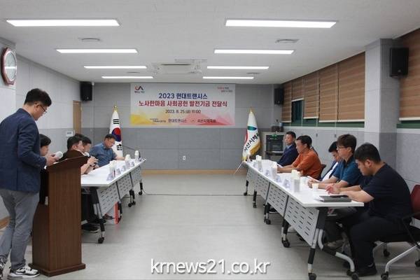 25일 서산시체육회 회의실에서 현대트랜시스 조현남 상무, 백신일 노조 지회장과 서산시체육회 윤만형 회장 및 관계자들이 참석한 가운데 엘리트 체육 발전 기금 전달 행사를 진행했다.