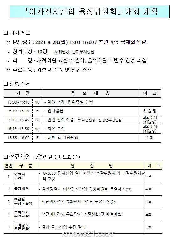 ▲ 사진=울산광역시울산시는 8월 28일(월) 오후 3시 시청 본관 4층 국제회의실에서 안효대 경제부시장 주재로 ‘제1회 이차전지산업 육성위원회’를 개최한다고 밝혔다.