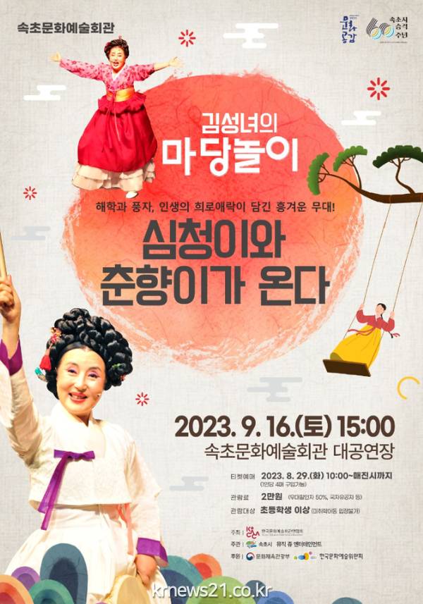 ▲ 사진=속초시속초시는 시 승격 60주년 기념 및 2023년 방방곡곡 문화공감 사업으로 9월 16일 토요일 오후 3시 속초문화예술회관 대공연장에서 전통극『김성녀의 마당놀이-심청이와 춘향이가 온다』를 개최한다.