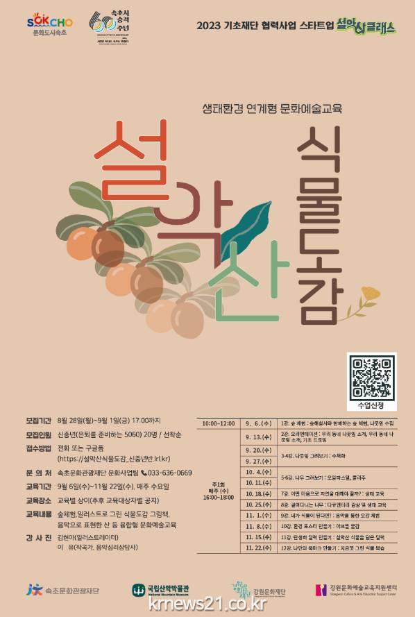 ‘「설악산 식물도감」 신중년반’의 참여 신청은 전화(☎033-636-0669) 또는 구글폼(https://설악산식물도감_신중년반.lrl.kr)을 통해 선착순으로 모집하며, 자세한 사항은 속초문화관광재단 홈페이지에서 확인할 수 있다.