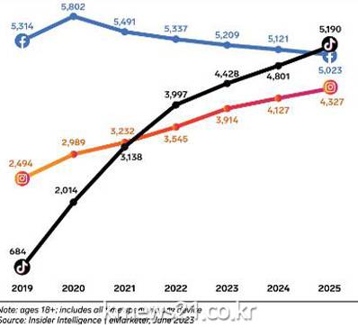 보고서는 2025년 미국 18세 이상 성인이 하루 동안 틱톡을 이용하는 시간은 총 51억 9천만 분으로, 페이스북의 50억 2천300만 분을 뛰어넘을 것으로 예측했다.