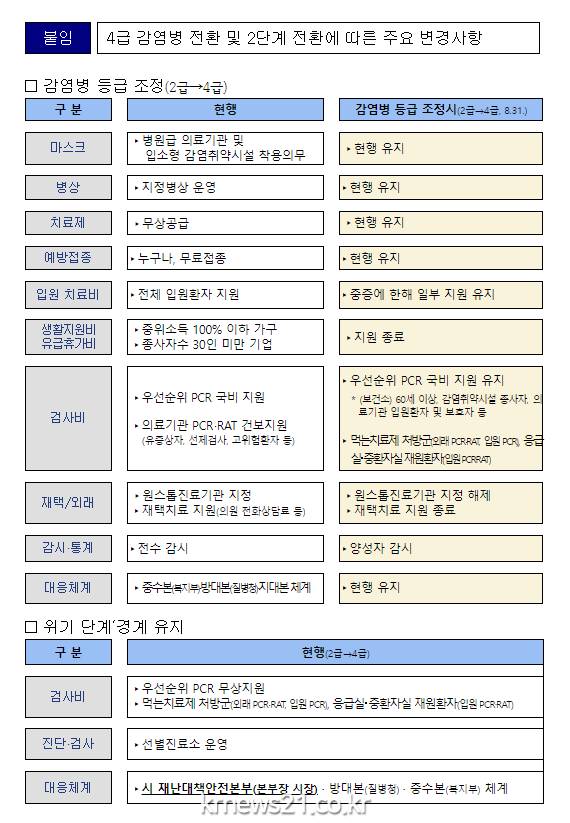 코로나19가 4급 감염병으로 전환됨에 따라 위기단계 조정 로드맵(3월 29일 발표)에 따른 2단계 조치가 시행된다.