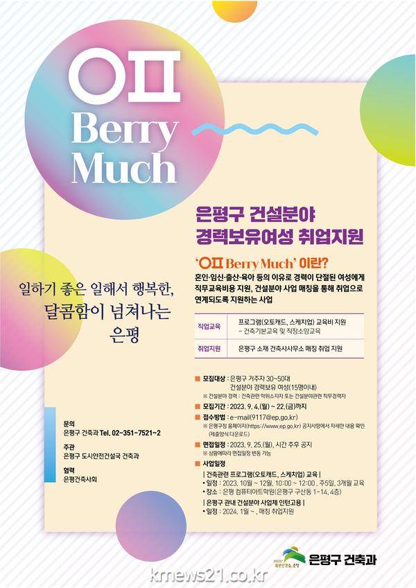 ‘ㅇㅍ Berry Much’란 은평, 달콤한(Berry), 넘쳐나는(Much)의 합성어로 ‘일하기 좋고 일해서 행복한, 달콤함이 넘쳐나는 은평’이라는 의미가 있다. 이는 건설 분야의 경력을 보유하고 있는 전문직 여성들에게 직업교육 비용을 지원해 주고 취업의 기회를 지원하는 사업이다.