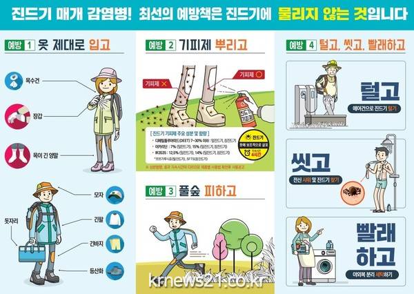 시 보건소 관계자는 “진드기 매개 감염병은 진드기에 물리지 않는 것이 최선의 예방책으로 야외활동 시 피부가 노출되지 않도록 긴 옷을 착용하고 기피제를 사용해야 한다.”라며“진드기에 물린 후 2주 이내에 고열, 근육통, 소화기 증상, 가피 등이 나타나면 즉시 의료기관을 방문해 검사받길 바란다.”라고 당부했다.
