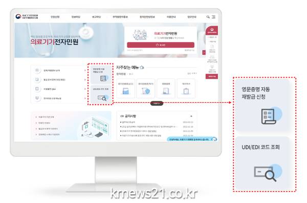 ▲ 사진=식약처 홈페이지 캡처식품의약품안전처는 의료기기 영문 증명서 재발급 절차를 자동화하고 의료기기 고유식별코드(UDI)-요양급여코드(EDI) 통합검색 서비스를 시작한다고 오늘(11일) 밝혔다.