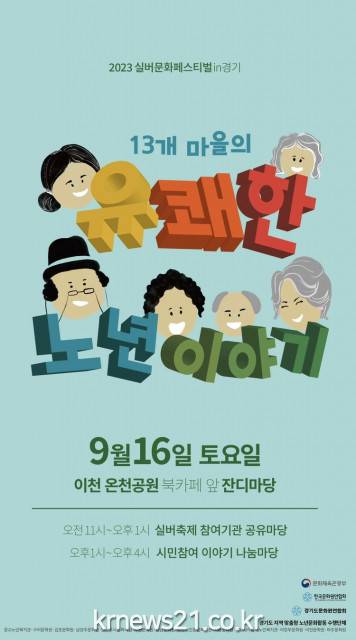 ‘2023 실버문화페스티벌 in 경기’는 ‘13개 마을의 유쾌한 노년 이야기’라는 주제로 개최된다. 60대 이상 어르신들의 이야기가 담긴 씨앗엽서, 화투점, 펜화, 사진관, 마음약방 등의 문화예술활동을 전시와 체험, 플래시몹 형태로 만날 수 있으며, 만인의 테이블, 세대이해마당, 즐길거리, 휴식공간으로 구성된다.