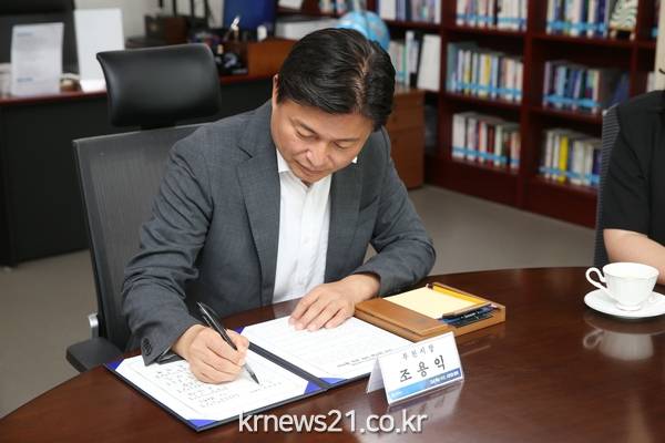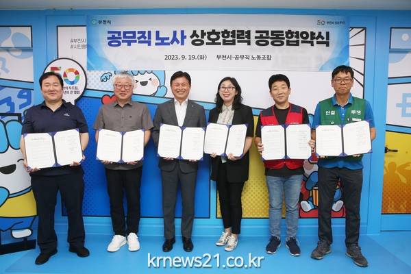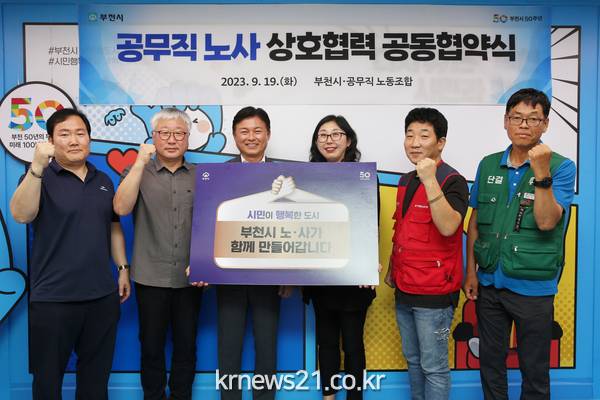 부천시(시장 조용익)는 지난 19일 오전 부천시청 시장실에서 공무직노동조합 대표와 상생문화 정착 및 공동발전을 위한‘공무직 노사 상호협력 공동협약’을 체결했다고 밝혔다.