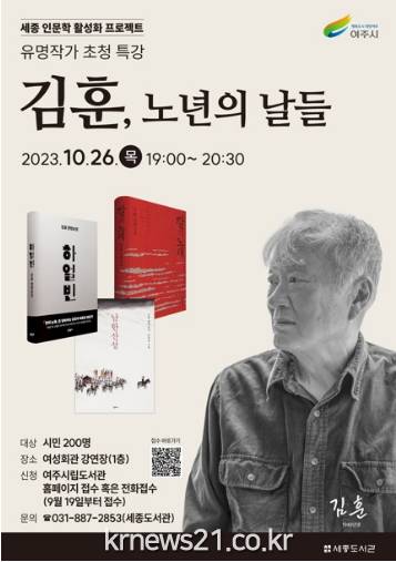 ▲ 사진=여주시여주시(시장 이충우)는 오는 10월 26일 목요일 오후 7시부터 김훈 작가 초청 특별강연을 진행한다.