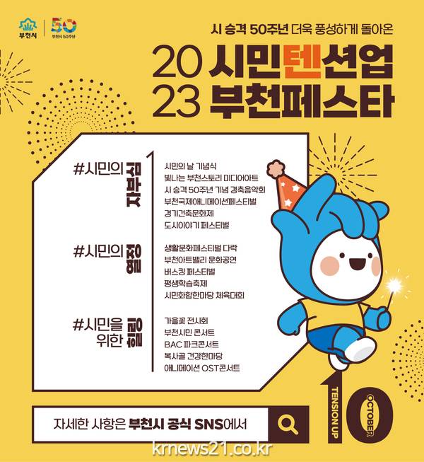 부천시(시장 조용익)는 10월 시민축제 꾸러미 ‘시민 텐션 업(Tension UP), 2023 부천페스타’을 소개했다. 올해는 시 승격 50주년을 맞아 ‘자부심·열정·힐링’을 주제로 예년보다 더욱 풍성한 즐길 거리를 제공한다.