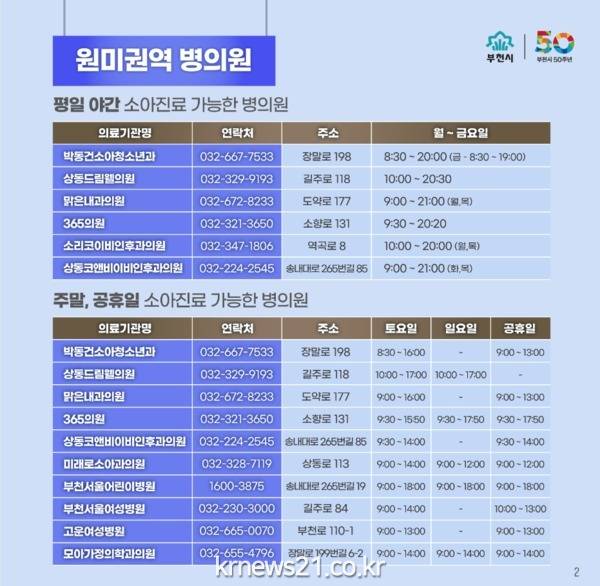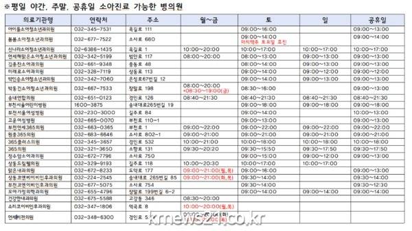 토·일요일 및 공휴일 진료가 가능한 병의원은 ▲신나라청소년과의원 10:00~17:00 ▲연세해맑은소아청소년과의원 08:00~13:00(토), 09:00~13:00(일, 공휴일) ▲김종찬소아과의원 08:00~14:00(토), 09:00~13:00(일, 공휴일) ▲미래로소아과의원 09:00~14:00(토), 09:00~12:00(일, 공휴일) ▲박인승소아청소년과의원 09:00~14:00(토), 09:00~13:00(일, 공휴일) ▲송내연합의원 08:40~21:30 ▲부천서울어린이병원 09:00~18:00 ▲부천연세365의원 09:00~22:00 ▲원종365의원 09:00~21:00 ▲365플러스의원 10:00~18:00 ▲365의원 09:30~15:50(토), 09:30~17:50(일, 공휴일) ▲정수암소아과의원 09:00~15:00(토), 09:00~12:00(일), 09:00~13:00(공휴일) ▲상동드림웰의원 10:00~17:00(토, 일)까지 운영한다.