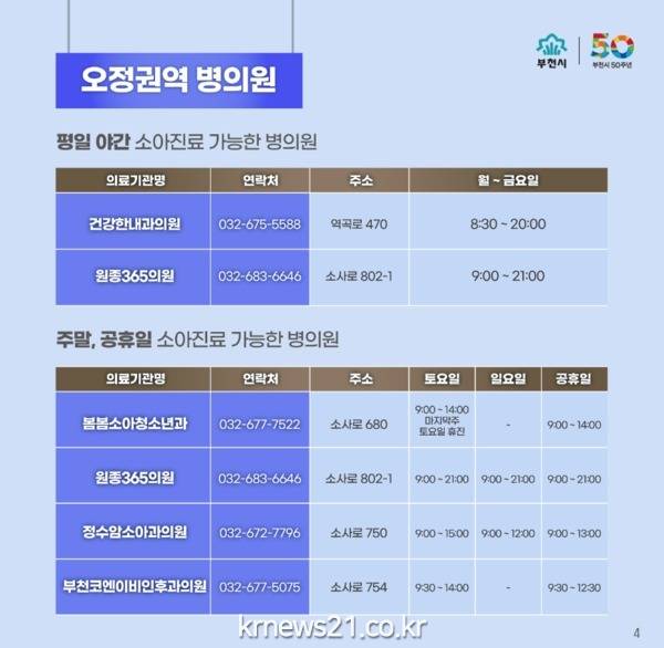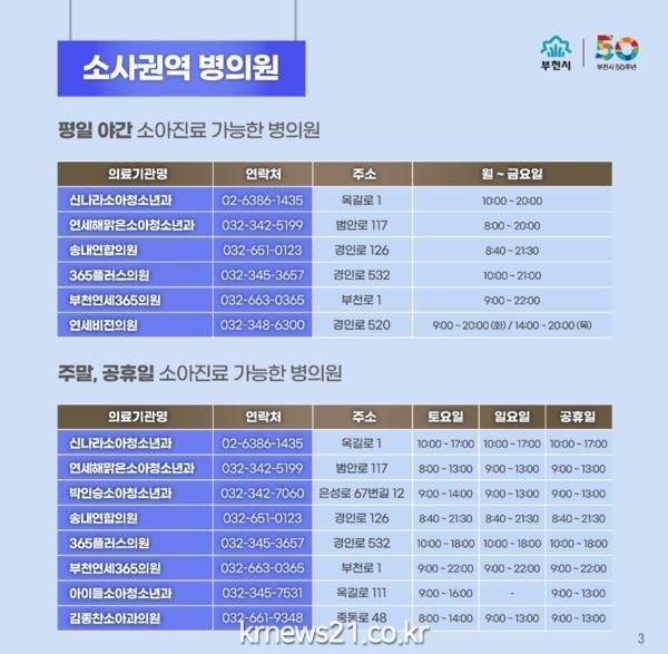 부천시 소아진료가 가능한 병의원 정보는 다음과 같다.
