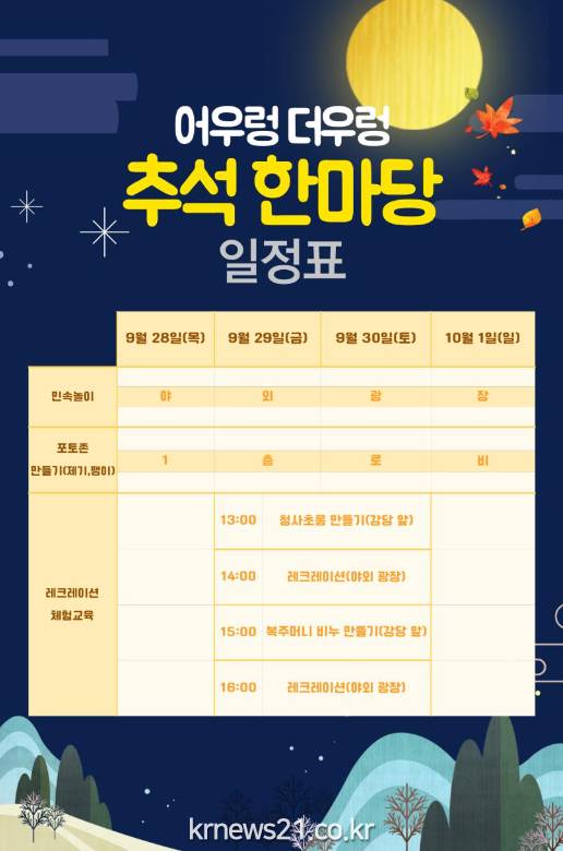 특히, 추석 당일인 9월 29일(금)과 9월 30일(토)에는 가족이 함께 참여할 수 있는 단체놀이와 함께 복주머니 비누 만들기, 청사초롱 만들기 체험 등이 진행될 예정이다.