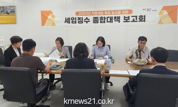 이러한 분위기 가운데 2023년 제2회 ‘세입징수 종합대책반’ 회의가 경제문화국장 주재하에 지난 25일 개최됐다. 세무1과, 세무2과 및 징수과 부서장과 실무 팀장이 참석한 이날 회의에서는 올해 국세 수입이 당초 예산보다 59조원 이상 세수 감소가 우려되는 상황에서 국세와 관련한 지방세입을 점검하고 그에 따른 대책을 논의했다.