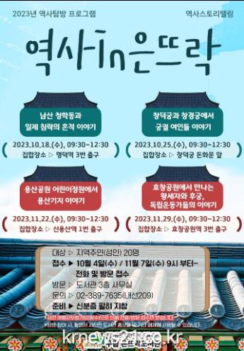 프로그램은 10월 18일과 25일 수요일에 남산 한옥마을과 창덕궁에서 ‘조선 그리고 일제까지의 흔적’ 주제로, 11월 22일과 29일 수요일에는 용산공원과 효창공원에서 ‘공원에서 만나는 역사 이야기’ 주제로 총 4회에 걸쳐 진행된다.