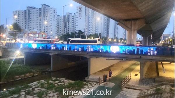 ▲ 사진=동대문구동대문구(구청장 이필형)가 정릉천을 가로지르는 용두교에 미디어글라스를 설치하여 지나가는 주민들의 눈길을 사로잡았다.