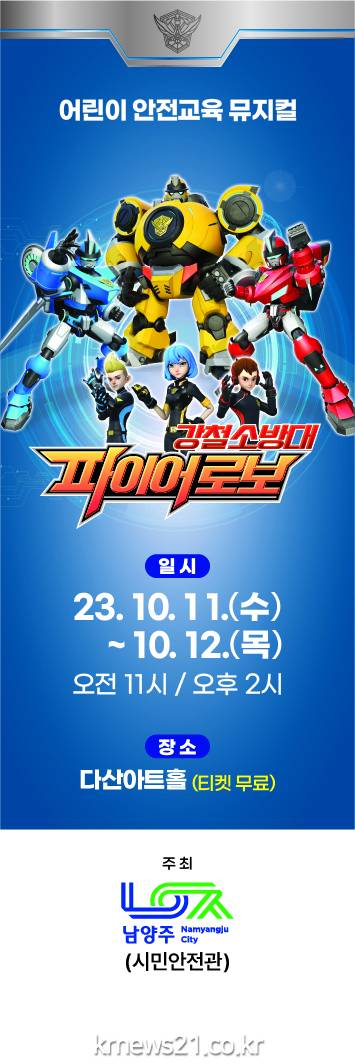 ▲ 사진=남양주시남양주시(시장 주광덕)는 오는 11일, 12일 다산아트홀에서 관내 어린이집 원아 1,500여 명을 대상으로 어린이 안전교육 뮤지컬‘강철소방대 파이어로보’를 진행한다고 5일 밝혔다.