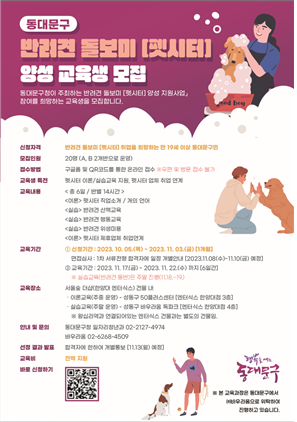 ▲ 사진=동대문구동대문구(구청장 이필형)가 10월 5일(목)부터 11월 3일(금)까지 ‘반려견 돌보미(펫시터) 양성 교육과정’ 참여자를 모집한다.