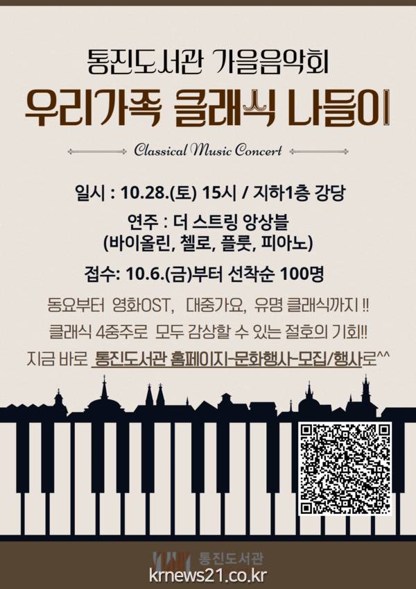 ▲ 사진=김포시김포시 통진도서관이 10월 28일 토요일 오후 3시부터 약 한 시간 가량 클래식 4중주가 연주하는 「우리가족 클래식 나들이」를 운영한다.