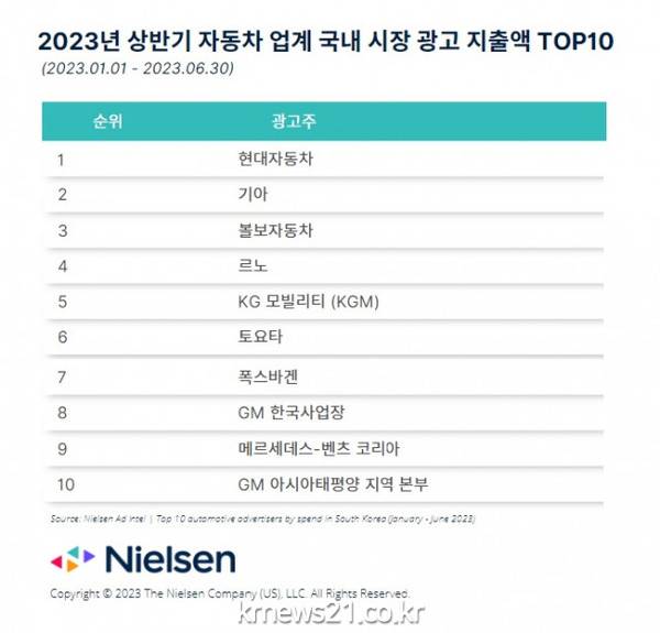 ▲ 사진=닐슨코리아아시아 지역 종합 광고비 모니터링 서비스 닐슨애드인텔(Nielsen Ad Intel)이 자동차 업계의 2023년 상반기 광고비 지출 총액과 업체별 국내 시장 광고 지출액 순위를 18일 발표했다.