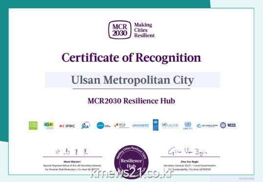 ▲ 사진=울산광역시울산시가 유엔 재난위험경감사무국(UNDRR, UN office for Disaster Risk Reduction)에 '재난복원력 중심도시'(Resilience Hub) 인증을 받았다.