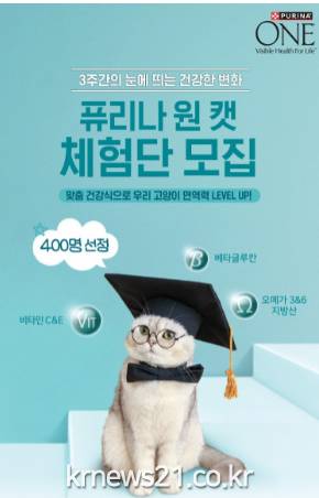 ▲ www.purinapetcare.co.kr세계적인 반려동물 식품 전문 기업 네슬레 퓨리나가 건강한 변화를 위한 반려묘 맞춤 식단 브랜드 ‘퓨리나 원 캣’을 직접 체험하고 소개할 체험단인 ‘퓨리나 원 캣 체험단’을 모집한다고 23일 밝혔다.