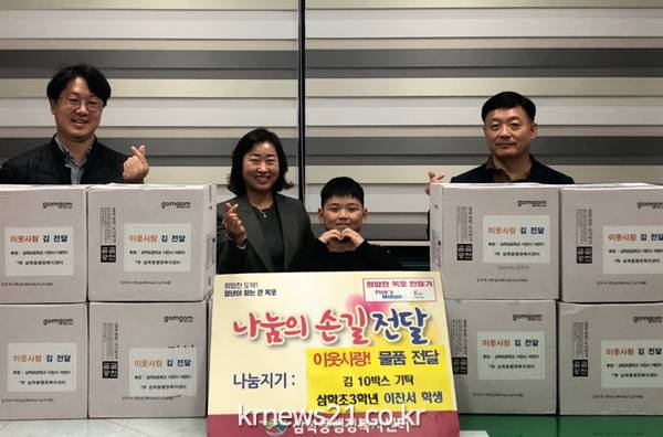 대성동 농협지점 지점장 정성욱 대표가 한부모 가정을 위해 써달라며 학습에 필요한 학습꾸러미 2세트를 기탁했고, 삼학초등학교를 다니고 있는 이찬서 어린이가 취약계층에 전달해 달라며 김 10박스를 삼학동 행정복지센터에 후원했다.