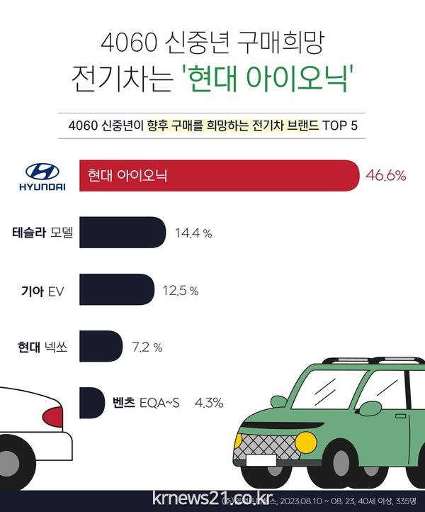 4060 신중년에게 앞으로 구매를 희망하는 전기차는 무엇인지 물었다. 그 결과 ‘현대 아이오닉’을 선택한 이들이 46.6%로 1위를 차지했다. 이어 ‘테슬라 모델’이 14.4%의 응답률을 보이며 2위를 차지했고, ‘기아 EV’가 12.5%로 3위를 기록했다.