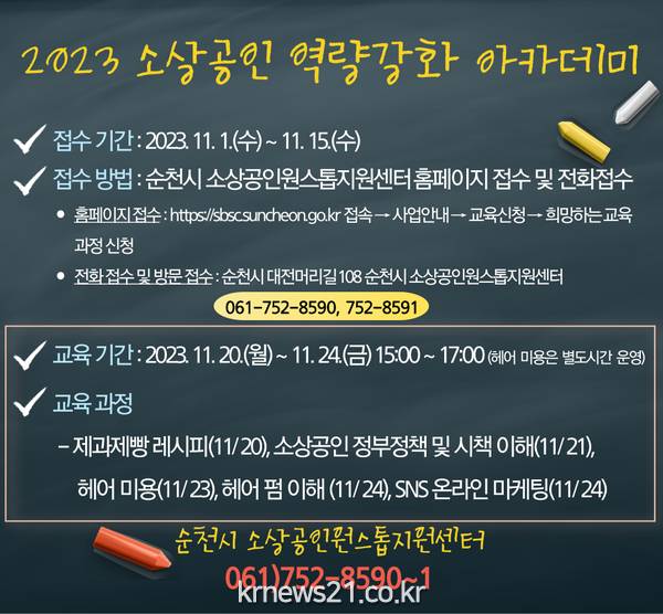 한편, ‘소상공인 웃어야 대한민국이 웃는다’라는 슬로건으로 순천시와 순천시소상공인연합회가 소상공인의 발전과 성장을 위해 힘을 모으고 있는 가운데, 골목상권의 위기 극복을 위한 자생력을 키우는 교육은 앞으로도 지속적으로 관심을 가지고 운영할 계획이다.