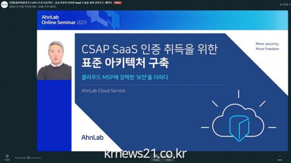 ▲ [사진=안랩]안랩(대표 강석균)이 11월 9일 네이버클라우드(대표 김유원), 아스트론시큐리티(대표 조근석)와 CSAP SaaS 인증 관련 전문지식 및 노하우 소개하는 안랩 온라인 세미나(AhnLab Online Seminar) 2023를 공동 개최했다.