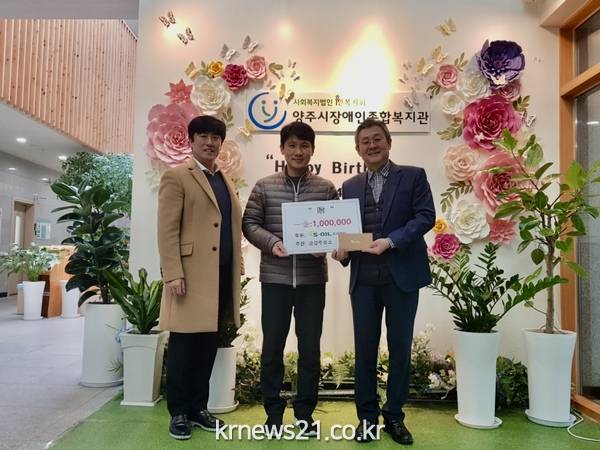 ▲ 사진=양주시청양주시장애인종합복지관(관장 김정희)은 지난 17일(금) 에쓰-오일(S-OIL)에서 ‘주유소 나눔N 캠페인’의 일환으로 주유상품권 일백만원을 전달했다고 밝혔다.