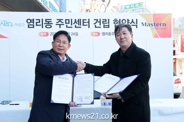박강수 마포구청장은 24일 협약식에서 “좁고 노후한 염리동 주민센터가 큰 예산 부담 없이 쾌적한 신청사로 탈바꿈하게 되어 참으로 기쁘게 생각한다” 며 “마포구민을 위해 주민센터 건립이라는 쉽지 않은 용단을 내려준 사업시행자 마스턴투자운용(주)에 마음 깊이 감사드린다”고 말했다.