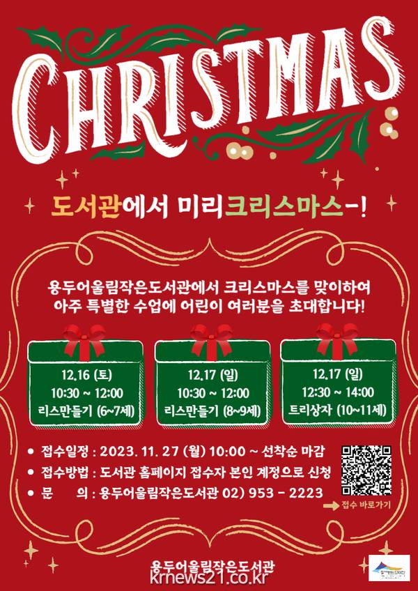 용두어린이영어도서관은 크리스마스와 산타클로스의 의미와 유래, 다른 나라의 크리스마스 문화를 배우고 함께 원서를 읽으며 인테리어 소품을 만드는 ‘나만의 크리스마스 인테리어 소품 만들기’ 특별 프로그램을 진행한다. 해당 프로그램은 초등 1~3학년(12월 9일 14:30~16:30), 초등 4~6학년(12월 16일 14:30~16:30) 총 2회 차로 운영된다.