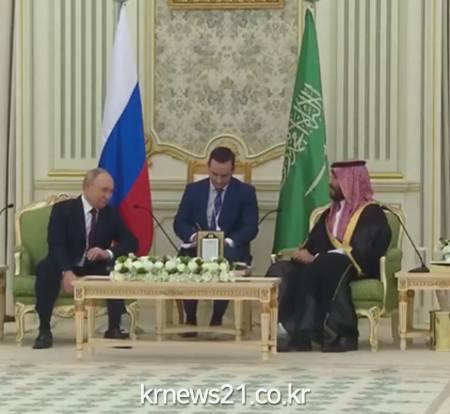 ▲ 사진=KBS NEWS 영상 캡처사우디 리야드에서 밀착을 과시한 푸틴 러시아 대통령과 무함마드 빈살만 사우디 왕세자.