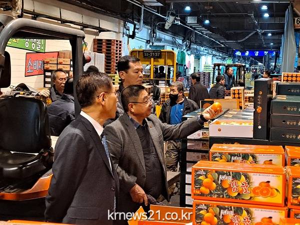 10일 저녁과 11일 새벽에 걸쳐 전국 최대 규모의 서울 가락동 농수산물도매시장을 방문해 감귤의 유통 처리 상황을 파악하고 도매시장 관계자들의 의견을 청취했다.