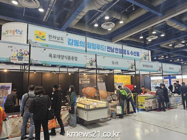 ▲ 사진=전라남도전라남도는 16일까지 서울 코엑스에서 개최되는 ‘2024년 설맞이 명절선물전’에 참여해 천일염과 전남 주요 수산물을 시식·판매하는 판촉 활동을 펼친다.