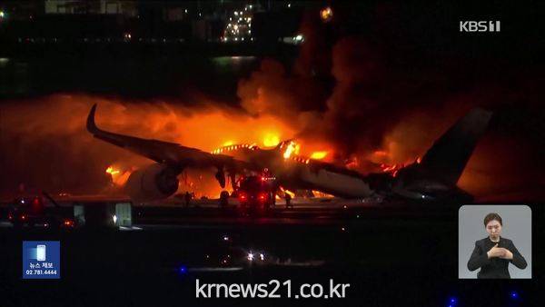 일본 도쿄 하네다공항 활주로에서 어제 저녁 일본항공(JAL)여객기가 해상보안청 항공기와 충돌해 큰불이 났다.