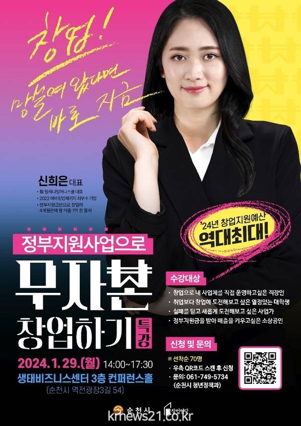순천시(시장 노관규)는 오는 29일 생태비즈니스센터 컨퍼런스홀에서 청년창업기반을 다지기 위한 ‘정부지원사업으로 무자본 창업하기 특강’을 진행한다.