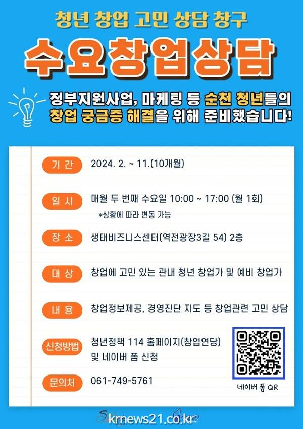 순천시(시장 노관규)가 운영하는 창업지원센터 창업연당에서는 창업을 고민하는 청년들을 위해 ‘수요창업상담’을 운영한다고 밝혔다.