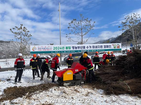▲ 사진=강원특별자치도강원특별자치도는 봄철 산불조심기간을 맞아 봄철 소각행위에 따른 산불발생을 예방하기 위해 영농부산물 수거 및 파쇄 캠페인을 2.16.(금) 산림청‧인제군‧인제군산림조합과 공동으로 추진했다고 밝혔다.