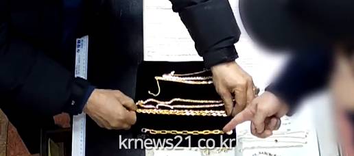 ▲ 사진=KBS NEWS 영상 캡처평택의 한 금은방, 한 남성이 전화 통화를 하며 목걸이를 살펴본다.