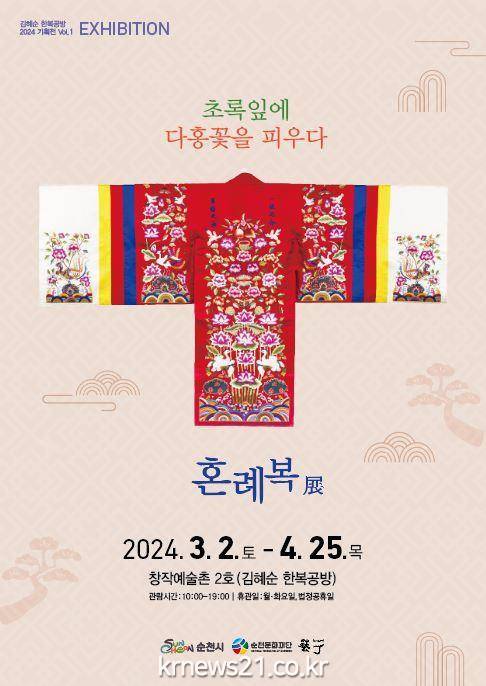 순천문화재단(이사장 노관규)에서 운영하는 순천 창작예술촌 2호 ‘김혜순 한복공방’이 전통 혼례복을 주제로 한 <</span>초록잎에 다홍꽃을 피우다> 전을 개최한다.