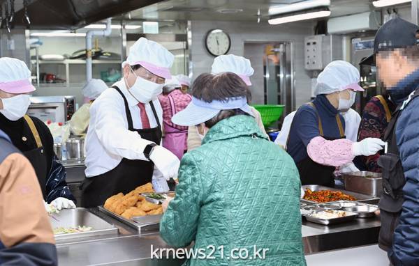 ▲ 사진=구리시구리시(시장 백경현)는 지난 20일 노인복지관(구리시 건원대로34번길 32-20) 식당에서 식당 이용 어르신들을 위한 급식 봉사활동을 펼쳤다.